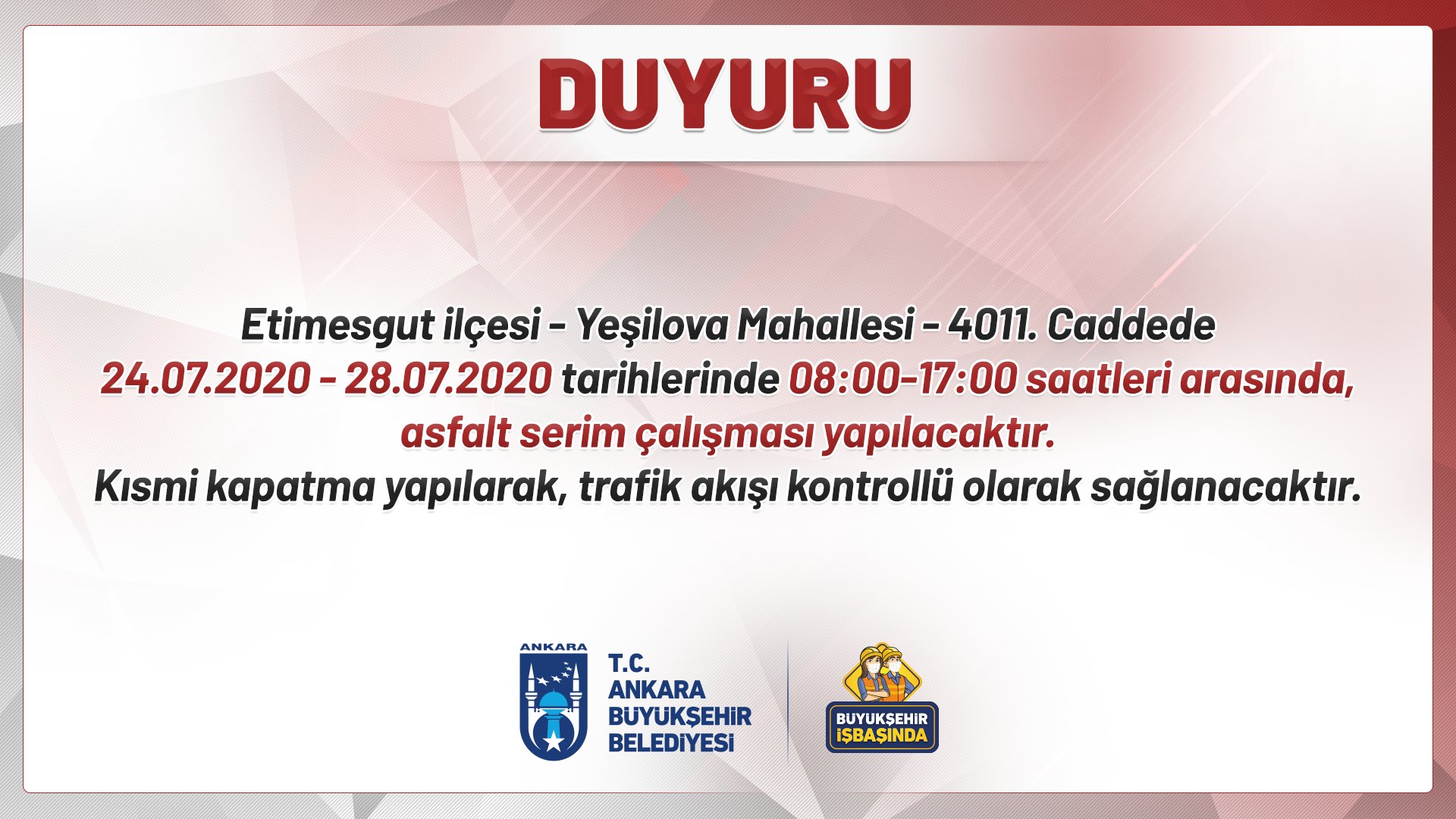 Ankara Buyuksehir On Twitter Asfalt Calismasi Sebebiyle Yollarda Uygulanacak Kismi Duzenlemeler 24 07 2020